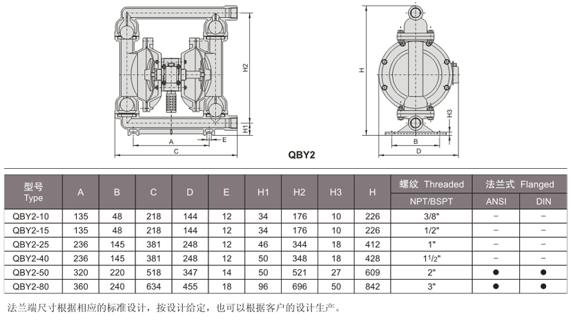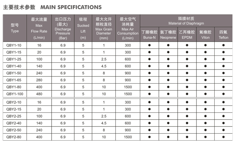 ■ 產(chǎn)品概述QBY 氣動隔膜泵既能抽送流動的液體,又能輸送一些不易流動的介質(zhì),具有自吸泵、潛水泵、屏蔽泵、泥漿泵和雜質(zhì)泵等輸送機(jī)械的許多優(yōu)點(diǎn)。